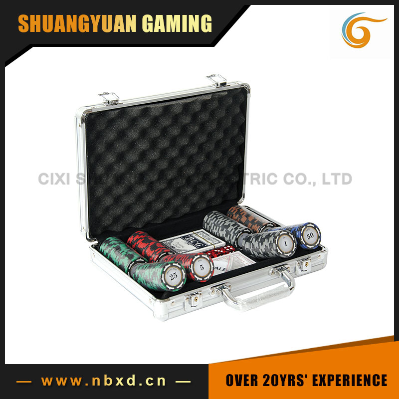 Poker chip: Model number:SY-E18, 14g 3color Clay sticker chip with available sticker Chip color available Customize sticker acceptable 1)Diameter: 40mm 2)Thickness: 3.3mm 3)Weight: 14g 4)Material:inner metal,clay finished 5)Chip color available 6)Customize sticker acceptable Poker chip set: Model number:SY-S54 1)200pcs 14g 3-color clay poker chips SY-E18; 2)1 aluminum case,solid cover and round corner; 3)2decks of playing cards; 4)5red transparent dice; 5)1stand dealer button; 6)FOB port:Ningbo harbor; 7)MOQ:1000sets; 8)Leading time:30days; 9)Package:each set has 2styrofoams,4sets in an outer carton; 10)Payment:by T/T or western union,35% deposit and 65% balance |