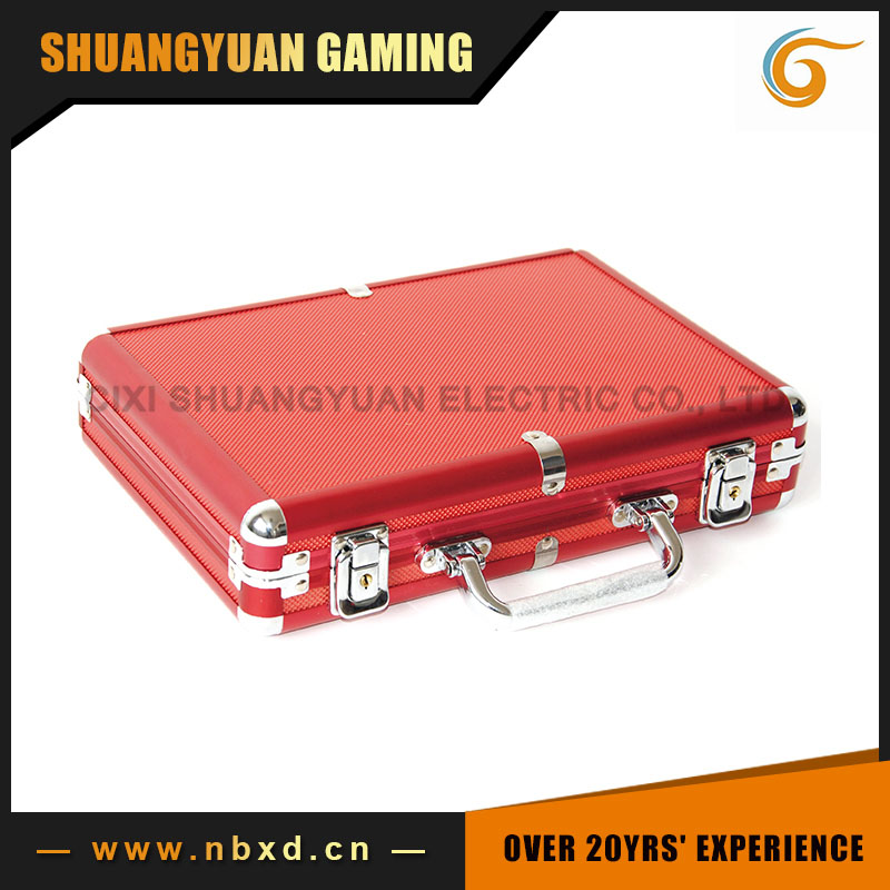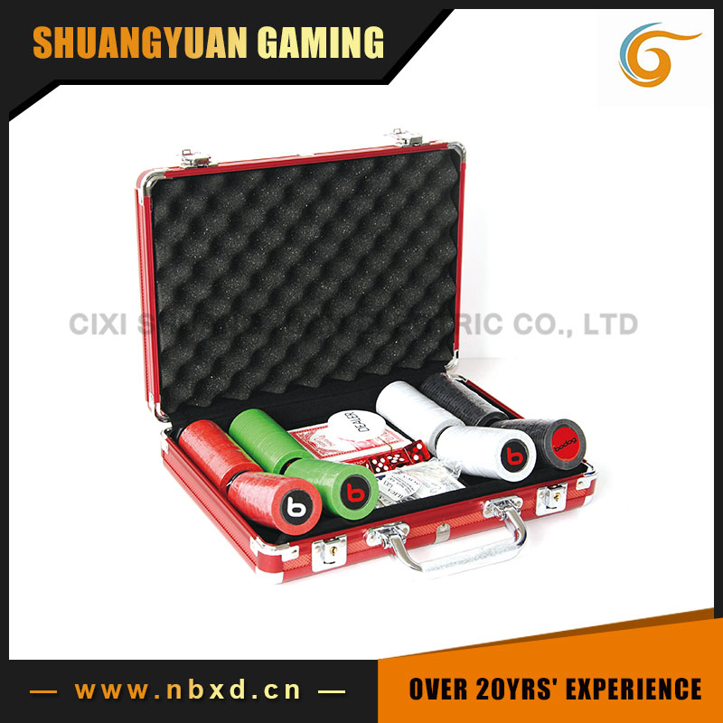 Poker chips: Model number:SY-C16 9.5g pure clay one color sticker chip with available sticker; Chip edge with bodog engraved; 1) Diameter: 40mm; 2) Thickness: 3.3mm; 3) Weight: 9.5g; 4) Material: pure clay; 5) Chip color and sticker style available; 6)bodog engraved on the edge of the chip; 7)High quality and competitively priced; Poker chip set: Model number:SY-S53, 200pcs 9.5g one color pure clay sticker poker chips SY-C16 in aluminum case,with solid cover,round corner and red color surface; 1)200pcs pure clay poker chips SY-C16; 2)1 aluminum case,solid cover,round corner and red surface; 3)2decks of playing cards; 4)5red transparent dice; 5)1stand dealer button; 6)FOB port:Ningbo harbor; 7)MOQ:1000sets; 8)Leading time:30days; 9)Package:each set has 2styrofoams,4sets in an outer carton; 10)Payment:by T/T or western union,35% deposit and 65% balance |