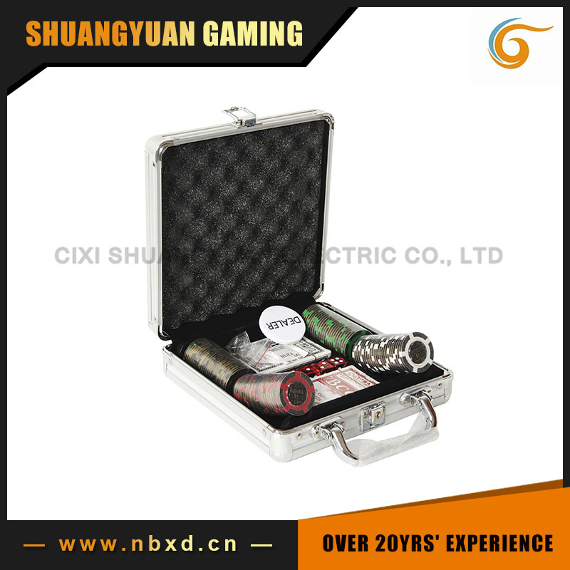 Model number:SY-S50 1)100pcs 16g tangiers metal poker chip SY-F06 2)2decks of playing cards 3)5red transparent dice 4)1stand dealer button 5)FOB port:Ningbo harbor 6)MOQ:1500sets 7)Leading time:30days 8)Package:each set has 2styrofoams,6sets in an outer carton 9)Payment:by T/T or western union,35% deposit and 65% balance