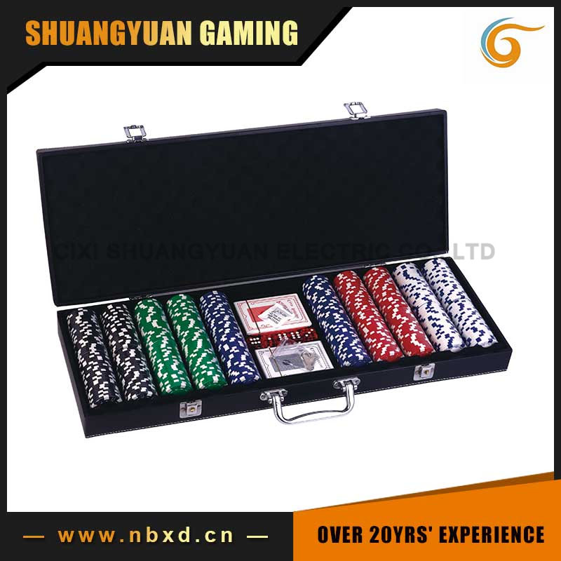 Model number:SY-S46 1)500pcs casino poker chips in black leather case(chip style available) 2)2decks of playing cards 3)5red transparent dice 4)1 stand dealer button 5)FOB port:Ningbo harbor 6)MOQ:600sets 7)Leading time:30days 8)Package:each set has 2styrofoams,2sets in an outer carton 9)Payment:by T/T or western union,35% deposit and 65% balance