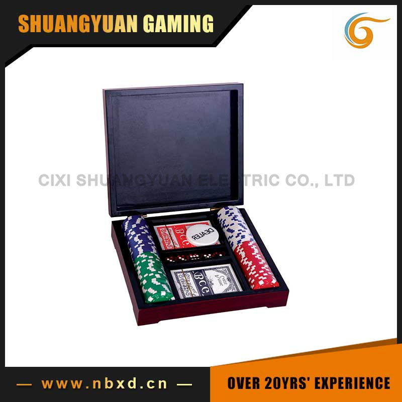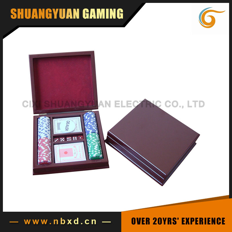 Model number:SY-S43 1)100pcs poker chips(chip style available) 2)red wooden poker chip case 3)2decks of playing cards 4)5red transparent dice 5)1stand dealer button 6)FOB port:Ningbo harbor 7)MOQ:1500sets 8)Leading time:30days 9)Package:each set has a inner carton,8sets in an outer carton 10)Payment:by T/T or western union,35% deposit and 65% balance