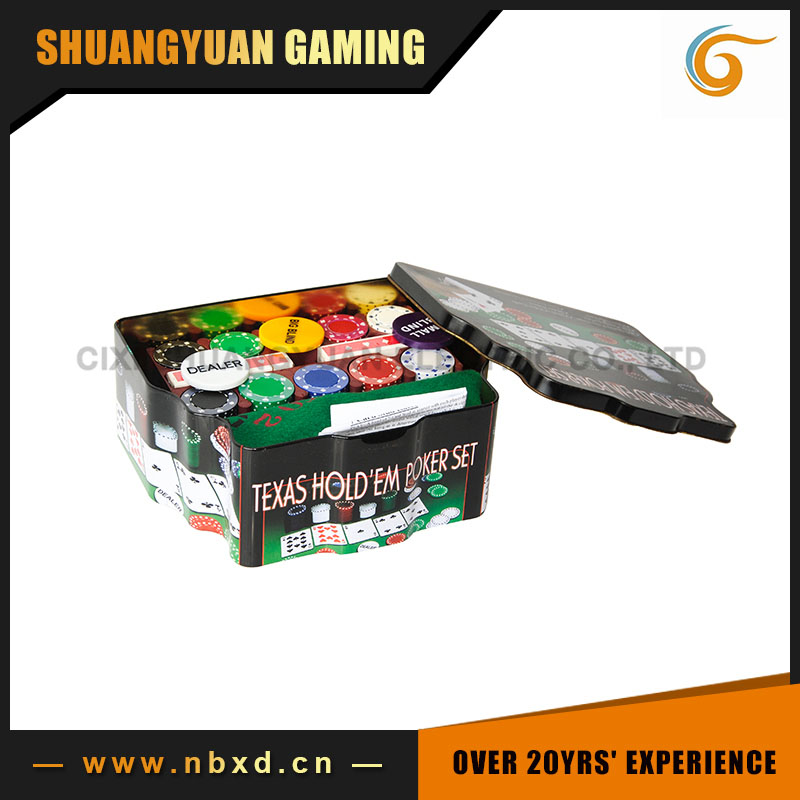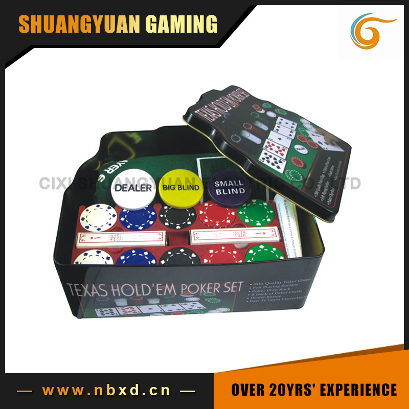 Model number:SY-S37 1)1 tin case 2)200pcs quality poker chips 3)1 felt playing surface (gaming mat) 4)2 decks of playing cards 5)1 dealer button,1 big blind,1 small blind 6)1 chip rack 7)Easy to learn instructions 8)Chip styles available 9)FOB port:Ningbo harbor 10)MOQ:3000sets 11)Leading time:30days 12)Package:each set has a shrink bag,4sets in an outer carton 13)Payment:By T/T or western union,35%deposit and 65% balance