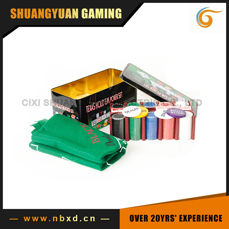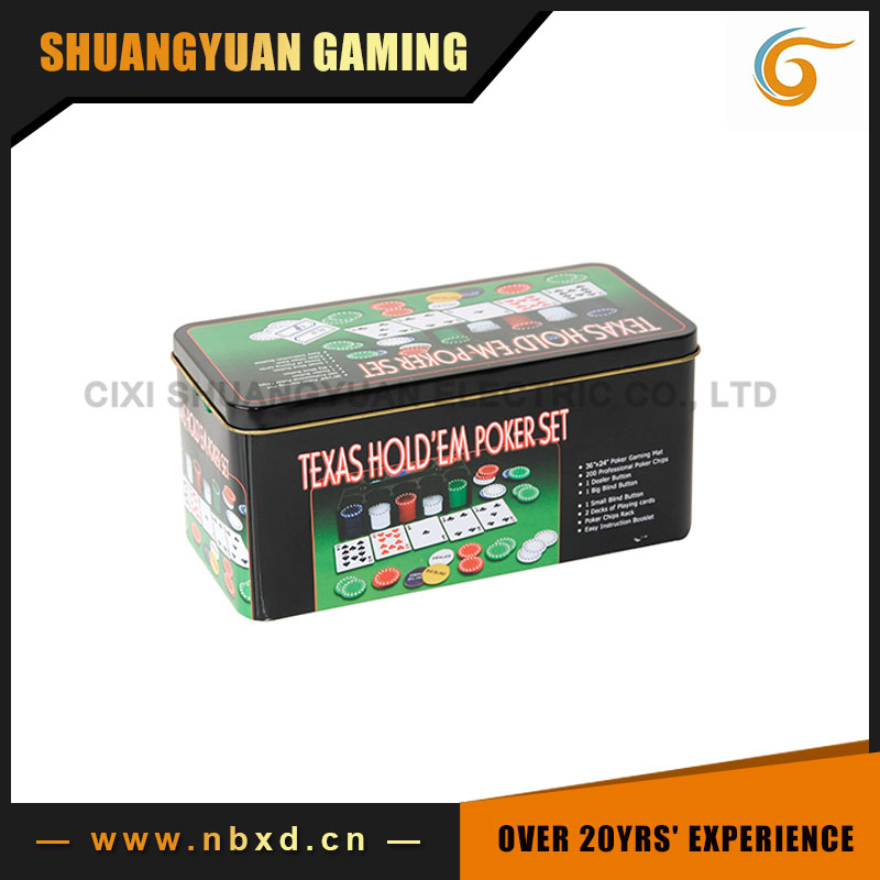 200pcs Texas Holdem Poker Set in Tin Case Model Number:SY-S35 1)1 poker gambling mat 2)200 professional poker chips 3)1 dealer button,1 big blind button,1 small blind button 4)2 decks of playing cards 5)Poker chips rack,Easy instruction booklet 6)FOB port:Ningbo harbor 7)MOQ:3000sets 8)Leading time:30days 9)Package:each set has a shrink bag,4sets in an outer carton 10)Payment:By T/T or western union,35%deposit and 65% balance